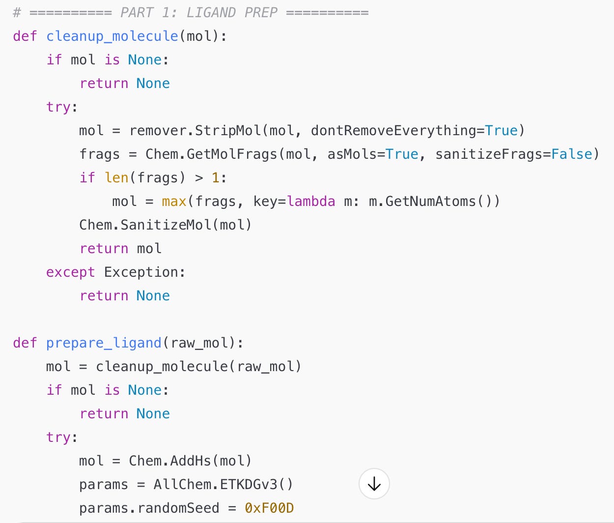 Integration Complexity: Connecting RDKit conformer generation → OpenMM/OpenFF energy screening → AutoDock Vina docking required solving dependency conflicts between OpenBabel, Meeko, and modern Python environments. We also hit classic issues like Python 2 Unicode encoding failures when processing compound names with non-ASCII characters - exactly the kind of low-level debugging that pulls you away from actual chemistry and can be a time sink. The final pipelines handle everything from SMILES to ranked poses.