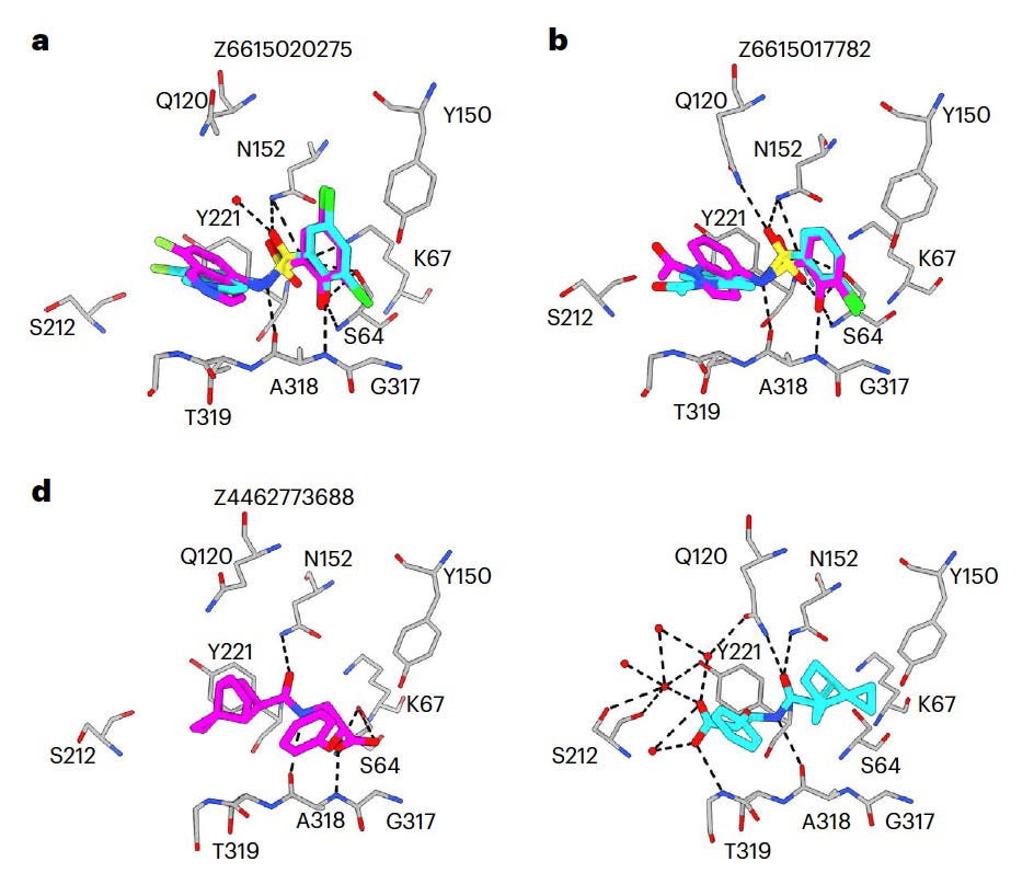 In the previous 99 million screen where 44 high-ranking molecules had been selected for synthesis and testing, five new inhibitors with activities ranging from 1.3 to 400 µM emerged. In the current 1.7 billion compound scenario, 1521 were synthesized and tested: of those, 1447 were experimentally well-behaved and 1296 were among the top 1% by score. Of those 1296, 168 had an apparent Ki of <166 µM and 122 had Ki values between 166 and 400 µM. Appropriate controls for aggregation (a confounding artifact the group has pioneered) were put in place. Overall, the hit rate from the larger campaign was 22.4%, about twice that of the 11.4% from the earlier 99 million campaign (for perspective, the bigger screen was 17x the smaller).